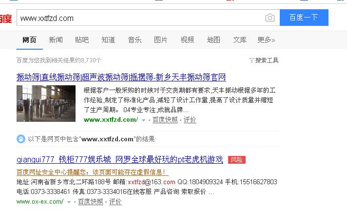 第二條信息,下面的地址,郵箱啊等等資料都是我們新鄉(xiāng)市天豐振動機(jī)械公司的,但是打開內(nèi)容,卻是一個很不的網(wǎng)站,我查看了一下源代碼,沒有我們公司的,這是什么情況呢,然后我又看百度快照信息,結(jié)果如下: